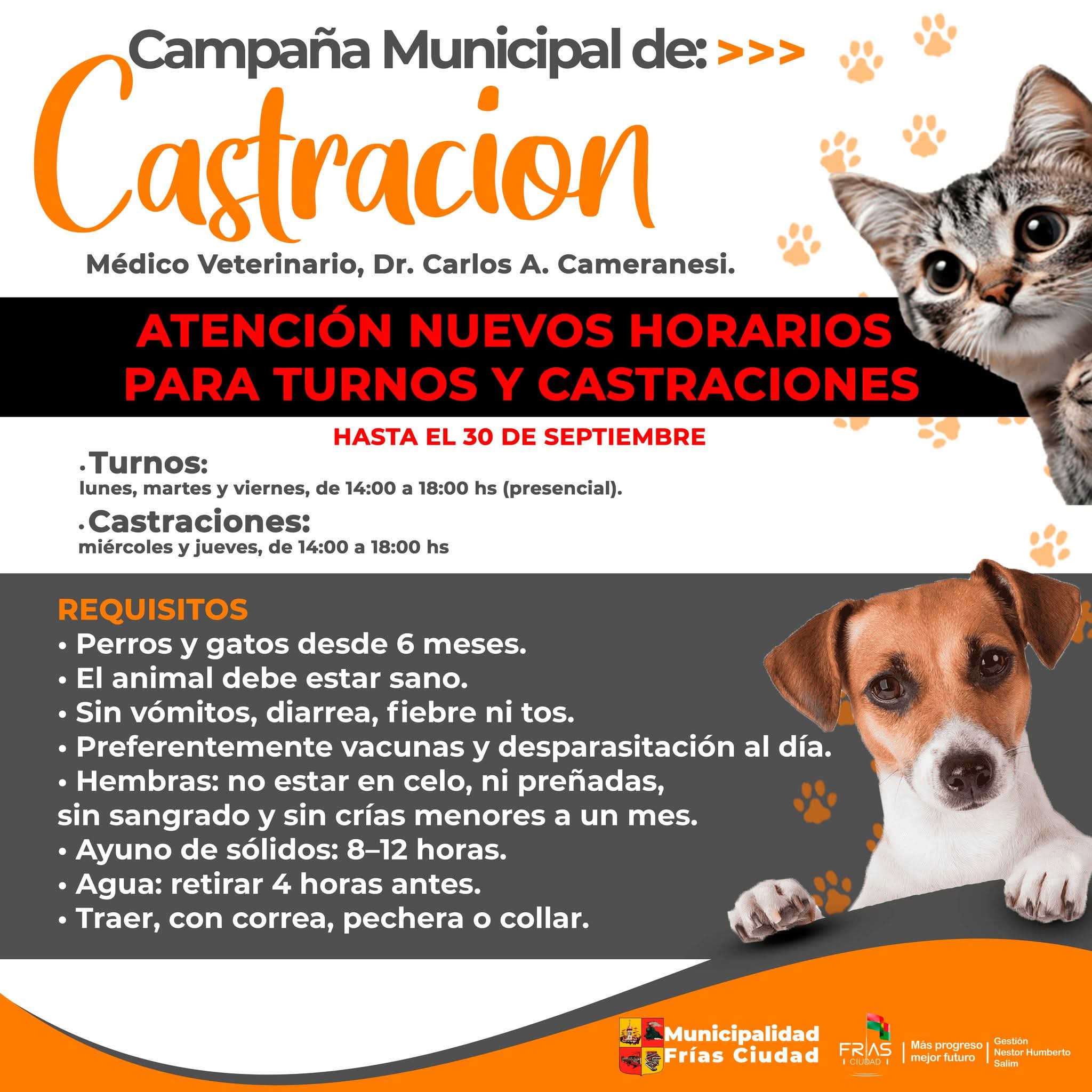 La Municipalidad de Frías informa que continúa la campaña gratuita de castración de mascotas, que se lleva a cabo en la Sala de Castraciones, ubicada en calle Esquiú 630, barrio Oeste.